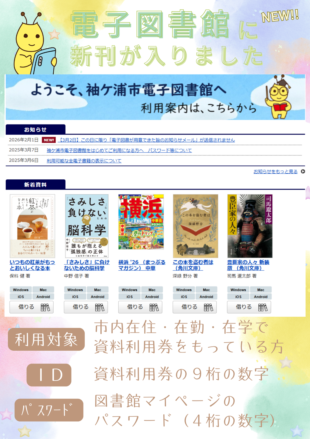 袖ケ浦市電子図書館に2月1日から新たに21コンテンツを追加しました。 ぜひご利用ください。 3月にも新たなコンテンツを追加予定です。